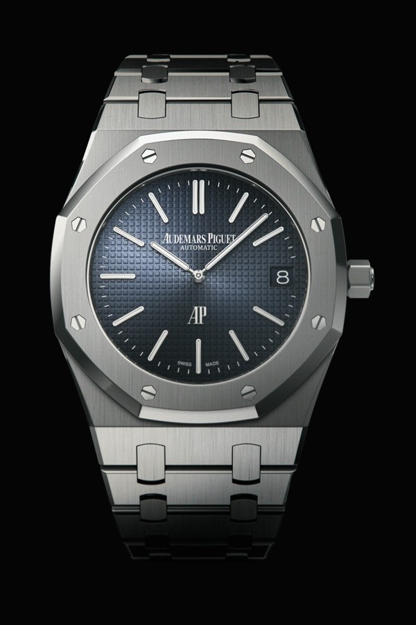 Last but not least, Audemars Piguet recently launched a couple new lines of their ever-popular Royal Oak series. This one is extra-thin, the Calibre 2121 movement being only 3.05 millimeters thick thick. The case and most everything else on the watch are made of stainless steel (a pink gold version is also available). The dial is blue and engraved with a Petite Tapasserie pattern. There is a date window at three o’clock, two batons at twelve o’clock, and one baton marking each of the other hours.