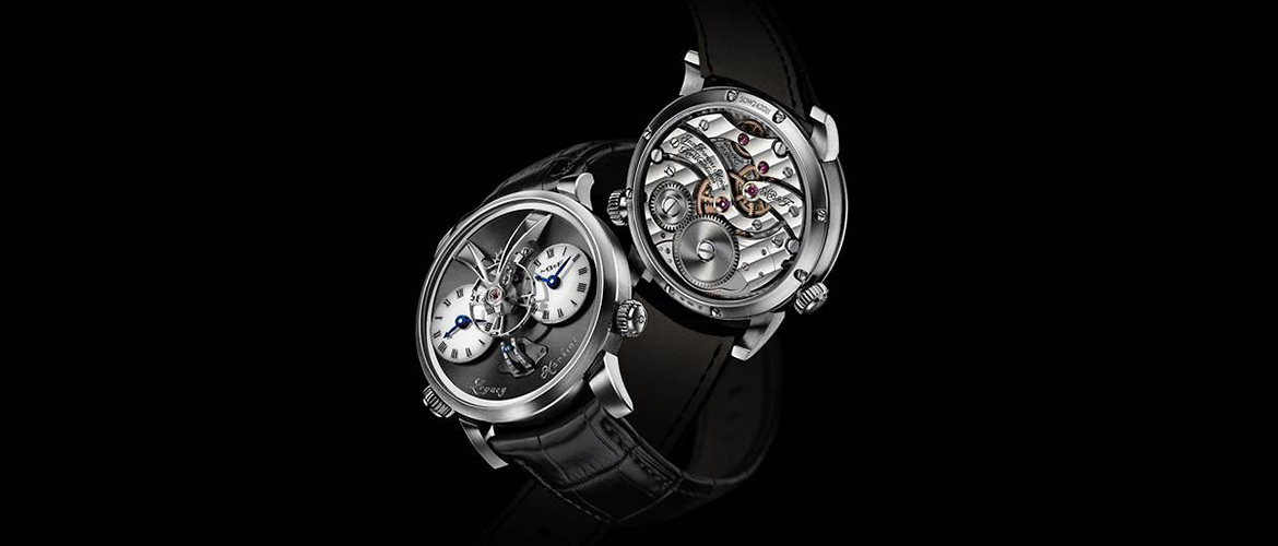 The watch that won the Men’s Watch prize was MB&F’s Legacy Machine No. 1. The unique design of this watch’s movement is immediately apparent- part of it is “floating” above the dial.  The balance wheel hovers above two large subdials that do all the timekeeping. Each one can be set to a different time, so it’s a good watch for traveling. The case is 44 millimeters wide and is 18 karat red gold (there’s also a white gold version available).  A sapphire window on the back of the watch shows the beautiful movement that powers this strange-looking watch.
