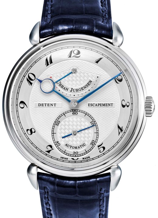 Another of this year’s great watches is Urban Jurgensen’s Chronometer P8 with Swiss Lever Escapement. A brand new hand-wound movement, the Calibre UJS P8, is housed within the watch’s 42-millimeter pink gold case. The silver dial has an engraved pattern of tiny ovals on it, with a sort of crosshatch pattern on the chronograph subdial. All of the hands are thin and blue, and the hour hand has a large pink-gold ring near its tip.