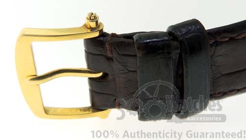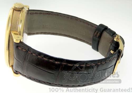 Model La Tradition 7027ba is quite a precious watch. Its 37mm case, crown, lugs and clasp are made of 18K yellow gold. The hour and minute hands are made of blued steel. The black Roman numbers are used for hour indexes. The polished gold case is protected by convex sapphire glass; it also has corrugated lateral surface. The case back with a sapphire glass window is closed under pressure. Watertightness of La Tradition 7027ba is 30 meters. The brown strap is made of crocodile leather, it has tang-type clasp executed of yellow gold also.