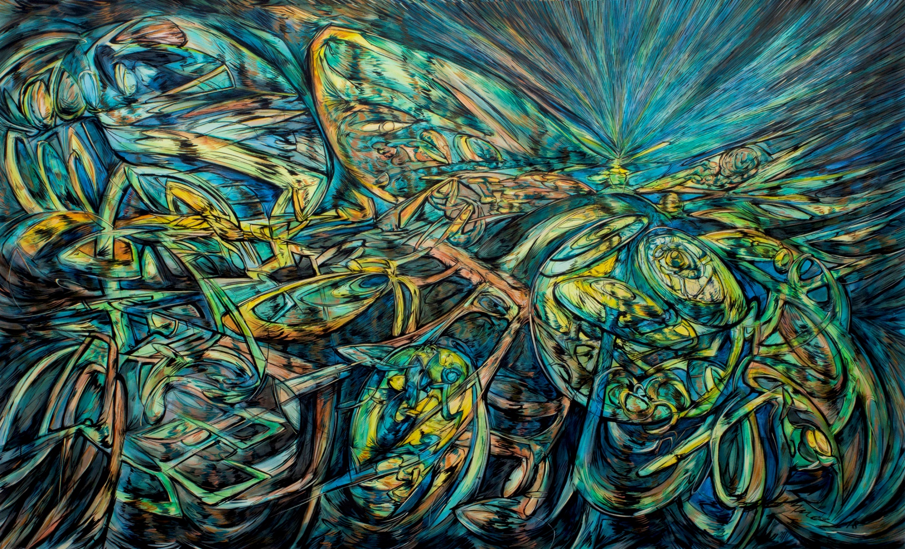 Upon graduation, the artist was engaged in the creation of audio and visual materials – namely, 3D animation and special effects – and worked in the digital TV sector. However, the long-standing need for pouring his heart and soul into paintings made Mendez get back to contemporary abstract art. Currently, he is one of the most significant figures of the Chilean artistic arena, with his bizarre landscapes and mesmerizing patterns. His masterpieces represent much more than just abstract art pieces – there is something hypnotic and spiritual about them. Alejandro Mendez himself admits that he comes up with different concepts for his artworks with the help of his subconscious mind. He also sees the painting process as somewhat therapeutic as he fills up the canvas with not only paints but his feelings and experiences as well.