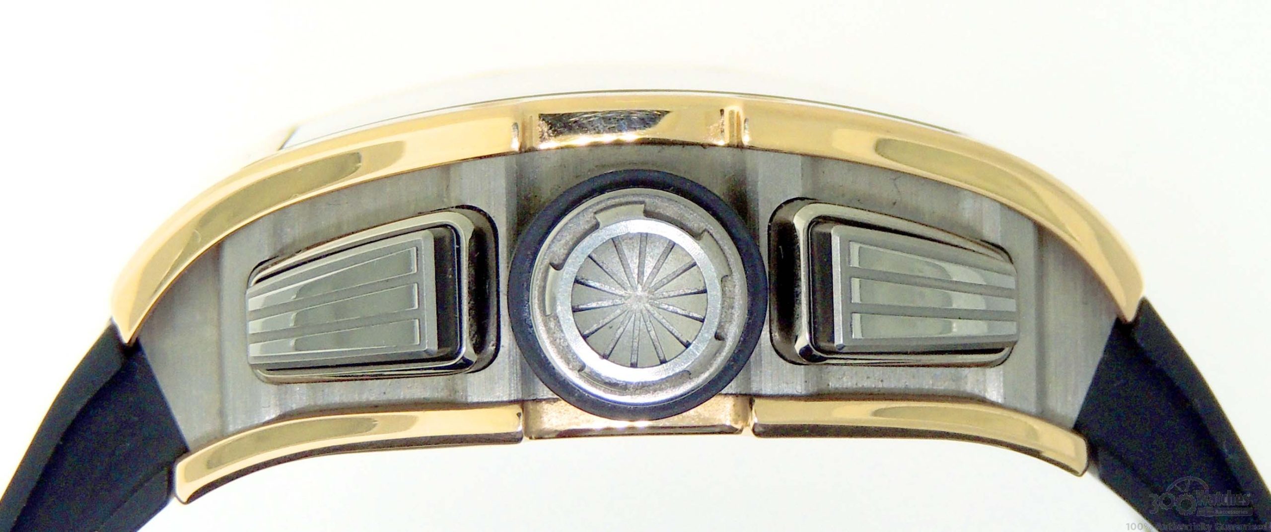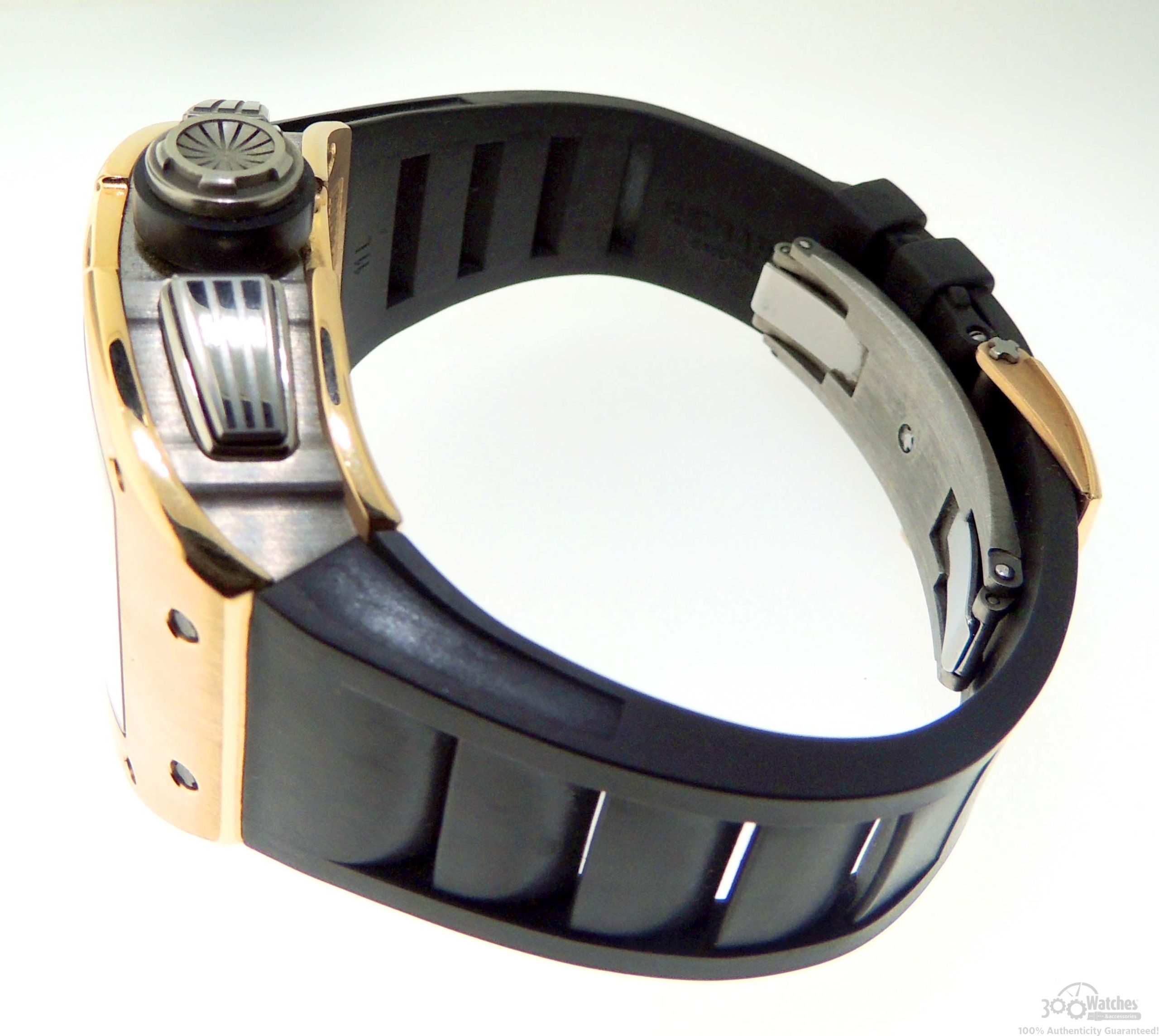 Black rubber strap with gold fastener doesn’t distract attention from the magnificent case. The fine automatic movement that is viewable trough transparent sapphire glass window in a case back, is responsible for accuracy of watch. RM011 Felipe Massa is a perfect choice for those men who appreciate multifunction and luxury.