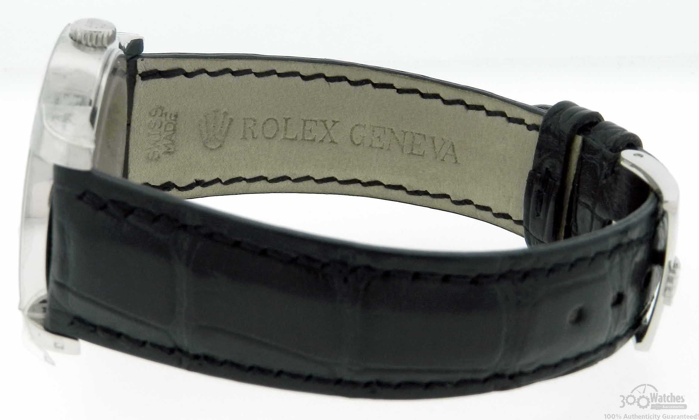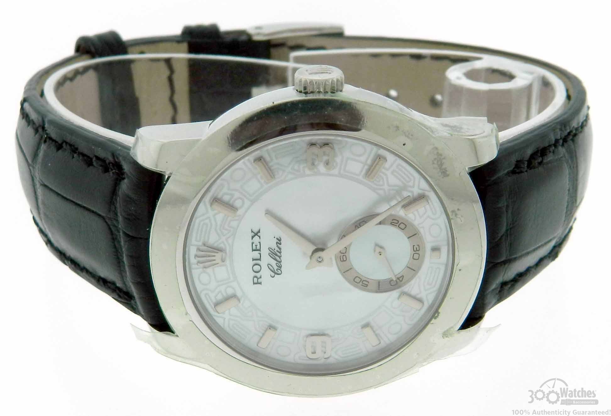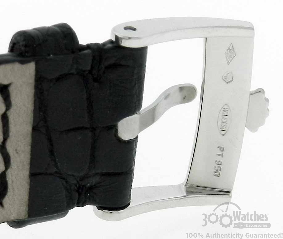 The 35 mm case, crown, lugs, case back and fastener of Rolex Cellini Cellinium 5240/6 are made of platinum. The same precious material was used for a dial decor. It is well known fact, that platinum is very expensive metal, for this reason, it is used only in the most exclusive watch and jewelry. Rolex Cellini Cellinium 5240/6 is an exactly such watch. The dial is made of white nacre. This material perfectly combines with platinum. Hour and minute hands together with hour markers are made of platinum also. The logo of the brand – platinum crown – is placed instead of 12 o’clock marker. The second counter is located at 6 o’clock. This watch comes on a soft black crocodile leather strap.